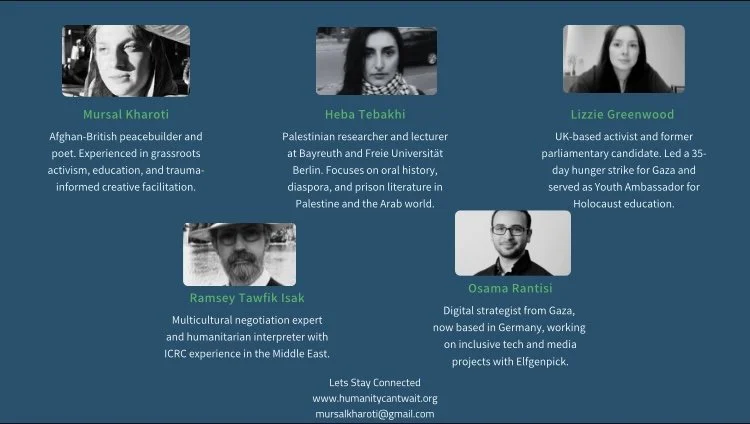 We are a diverse, international team united by a commitment to justice, dignity, and freedom for all peoples — especially those living under systems of oppression. Our work is rooted in the belief that meaningful peace requires truth, accountability, and the courage to name injustice. We are inspired by the principle: “Be the change you want to see in the world’’.